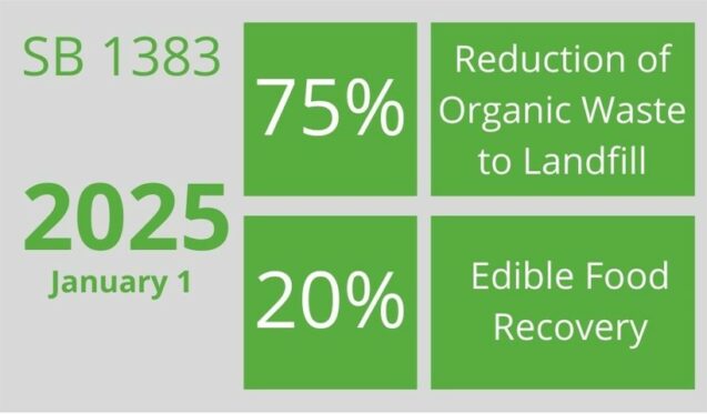 Regulations will take effect on January 1, 2022. The goal of SB 1383 is to reduce organic waste disposal to Landfill by 75%, and to rescue 20% of surplus edible food for the food insecure, both by January 1, 2025.